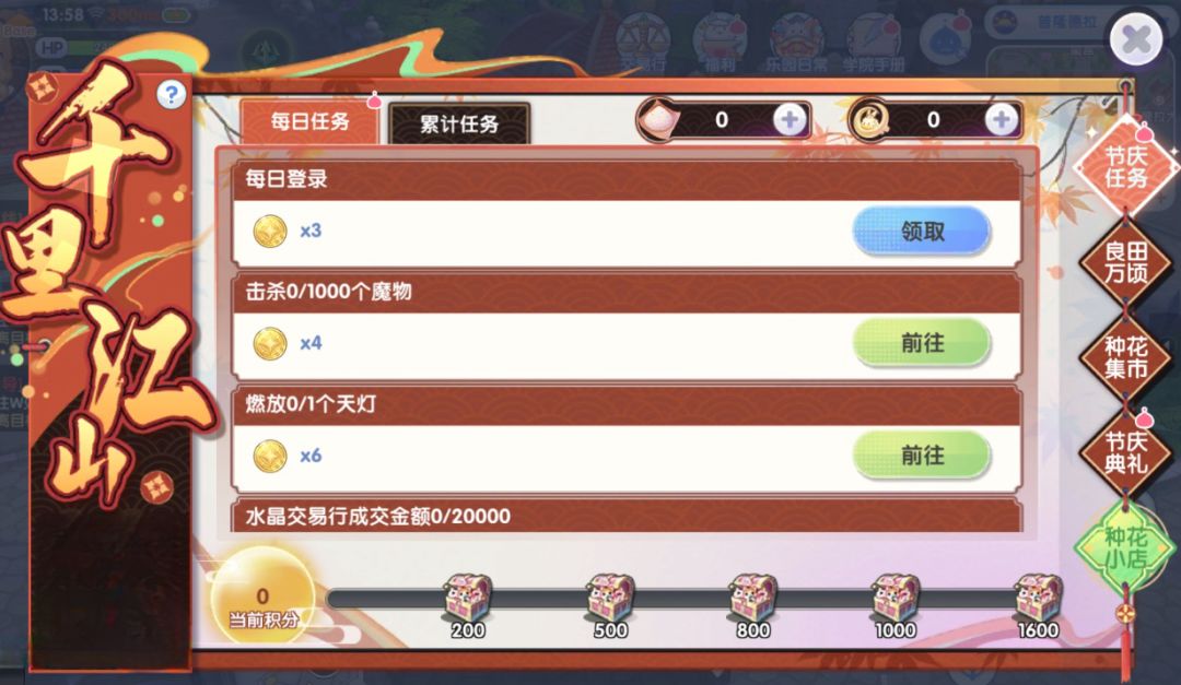 -节庆任务:活动期间,完成每日任务及累计任务可获取积分,累计的积分可以获得风华正茂&豆蔻年华头饰、绒绒兔尾、祈愿天灯等积分奖励。