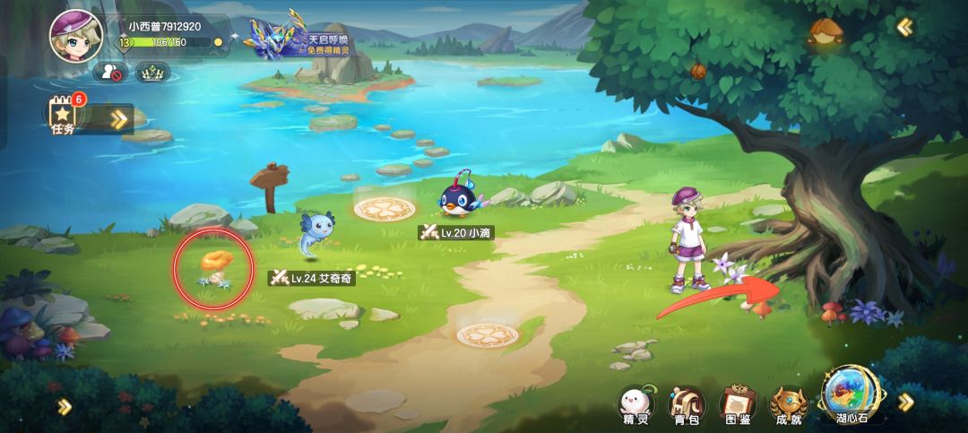 《垂钓的菈妮卡》:微风草地菈妮卡处接任务,会让你钓鱼,长按屏幕拉杆,鱼下面的进度条快空了松手,进度条恢复了再长按屏幕拉杆即可,完成后可获得紫色精灵球