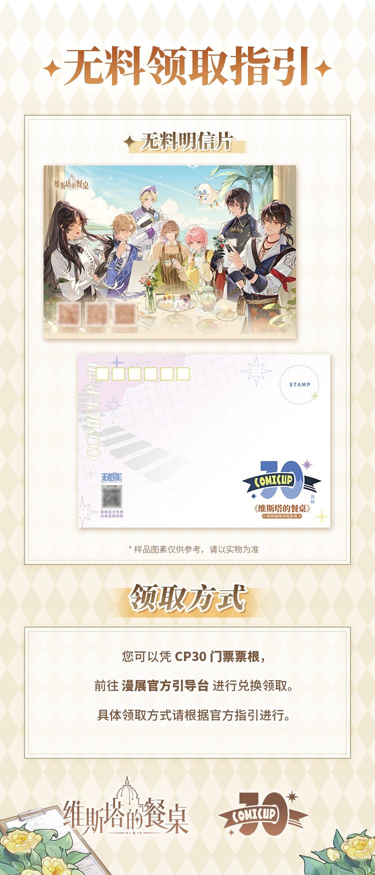 CP30期间(10月3日-4日、10月6日-7日)持本届票根,至场取特典处(详情请见cp官方信息),即可领取图示《维斯塔的餐桌》无料明信片一张,数量有限,送完即止~