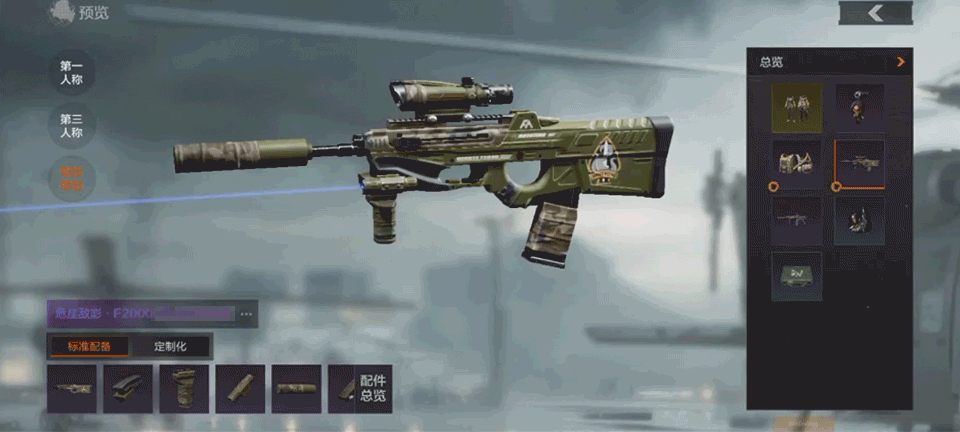 除了人物外观之外,危崖敌影军需还包含2款不同色系的枪械涂装。深绿色的危崖敌影·F2000为野外作战进行了一定程度改装,枪托上的深渊小队logo格外醒目。