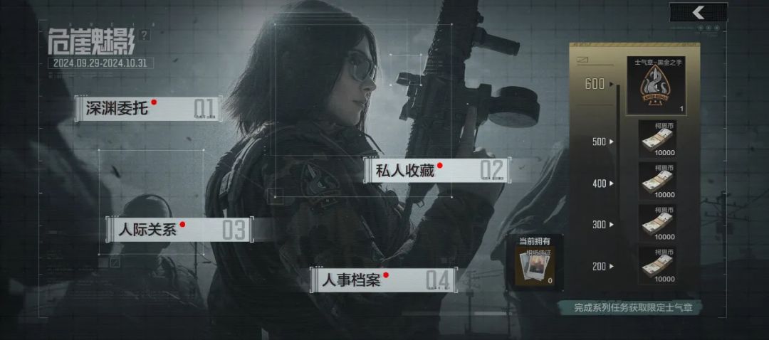 9月29日-10月31日,黑卡蒂主题活动危崖魅影开启,先锋们完成深渊委托和私人收藏,即可获得【相纸凭证】并解锁黑卡蒂对应人际关系和人事档案。累计获得一定数量的【相纸凭证】可兑换限定士气章【黑金之手】。先锋们一起来探寻黑卡蒂的剧情故事吧!