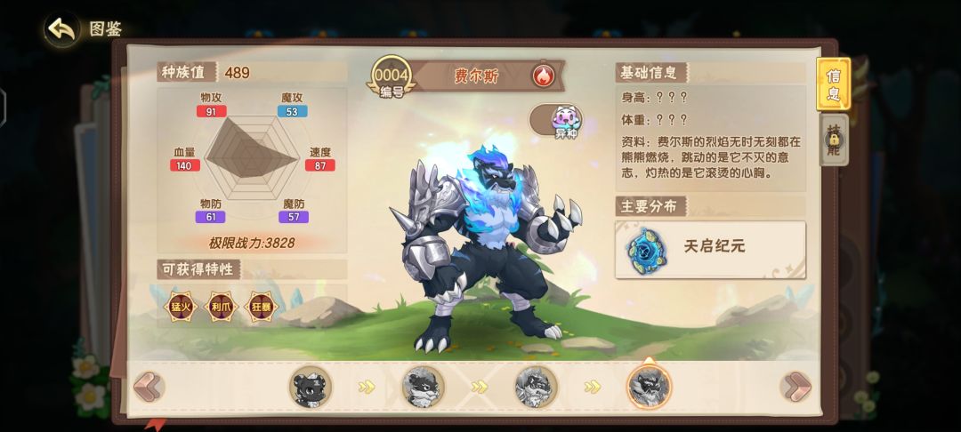 费尔斯:初始火系强攻手,速度和物攻都很高,除非想选别的初始宠物,不然费尔斯是不二之选