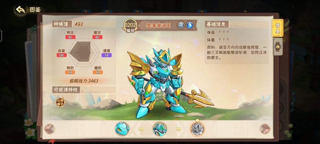 怒海漩涡王:初始水系强攻手(选水蛇可以暂时放置培养),前期打费尔斯进化挑战的主力输出手,配合遗志哈尼熊暴力输出