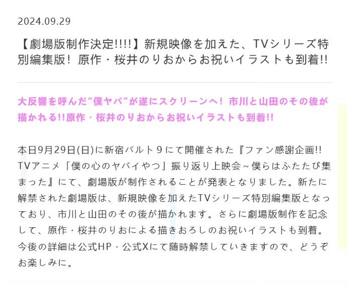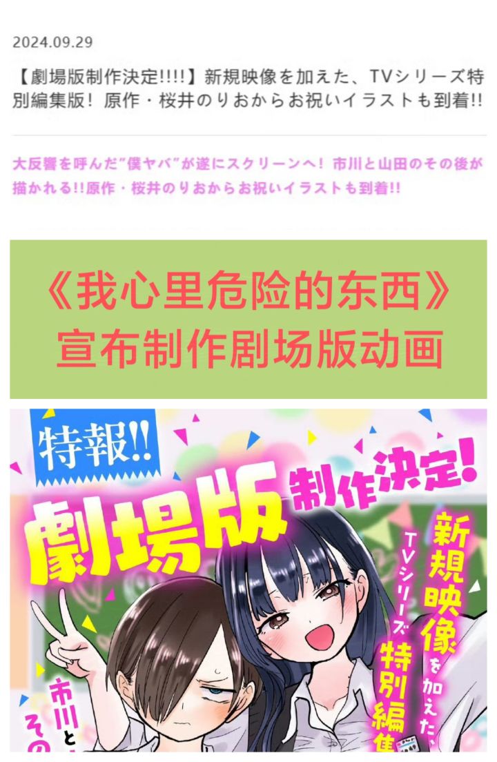 9/29号,《我心里危险的东西》官方宣布,确认将制作剧场版动画❗❗❗