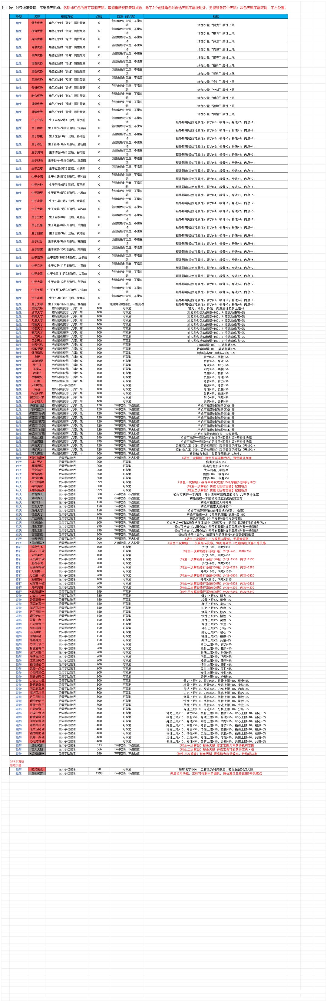 天赋表
