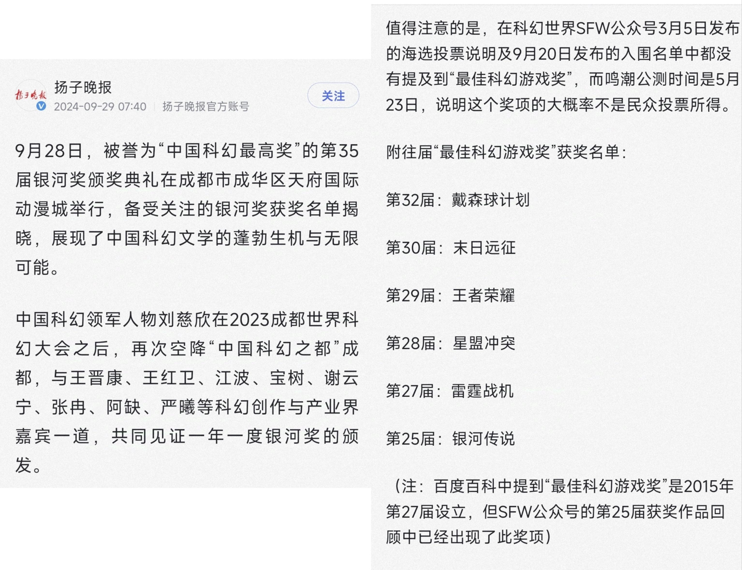 说一下含金量,可以理解成科幻圈内的评比,在游戏层面上由于之前的入围并没有游戏,所以是主办方自己加上去的,根据知乎考据往届获奖还出现了《王者荣耀》……