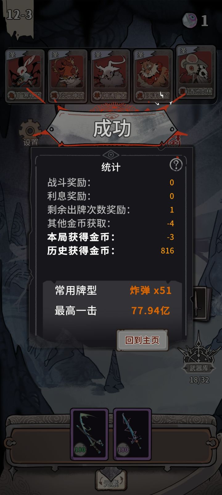 初始带70概率加货币的卡,后续慢慢把所有武器卡都换成一种,带齐5张圣卡,最终boss攻击一次直接通关。