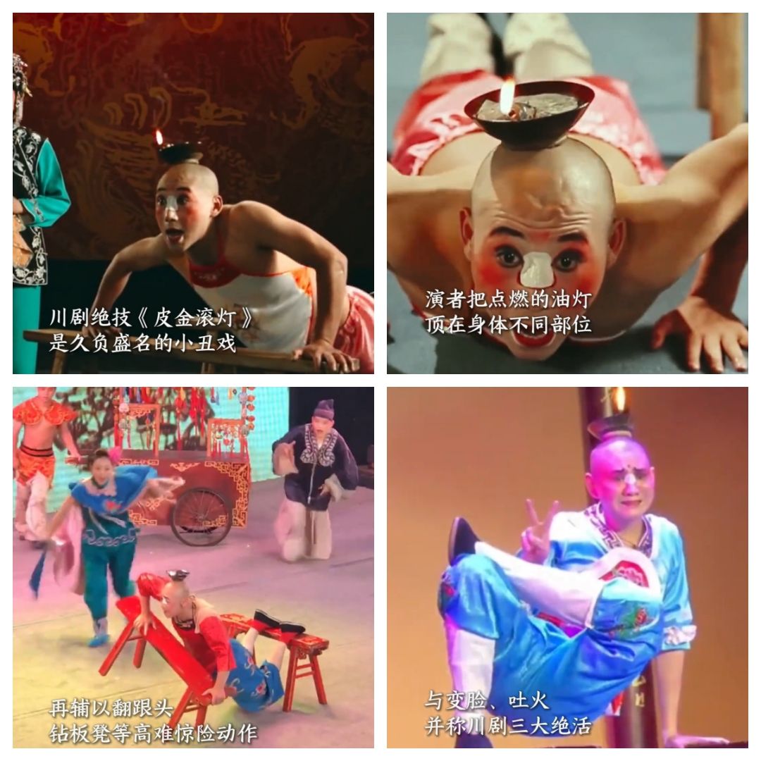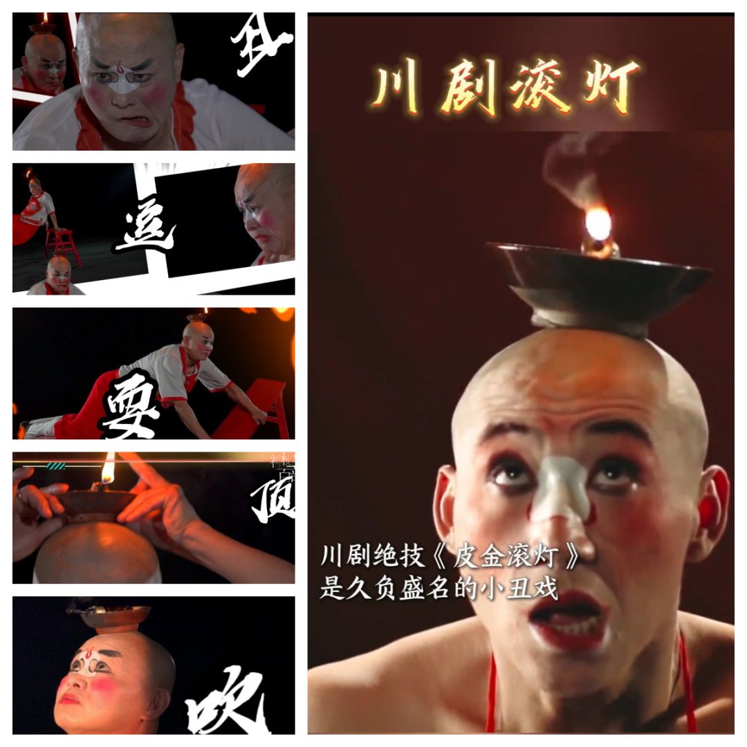 川剧滚灯绝技:丑逗耍顶吹。要不是小时候奶奶抱着看戏曲频道还有点印象,还真不一定想得到