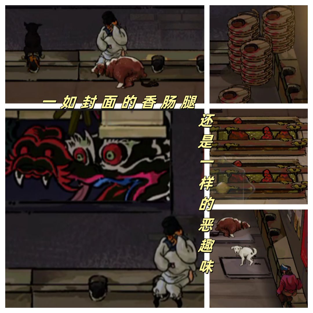 游戏中大头怪穿着条纹背带裤,裸露上身,在唐朝算是不合常规的搭配,成功吸引了观众注意力。至于 “红蓝条纹”,在唐朝那个服装色彩丰富多样,且主要以“红黄绿蓝紫”居多的时代,作为节日庆典的表演者,服装贴近这方面设计也很好理解。