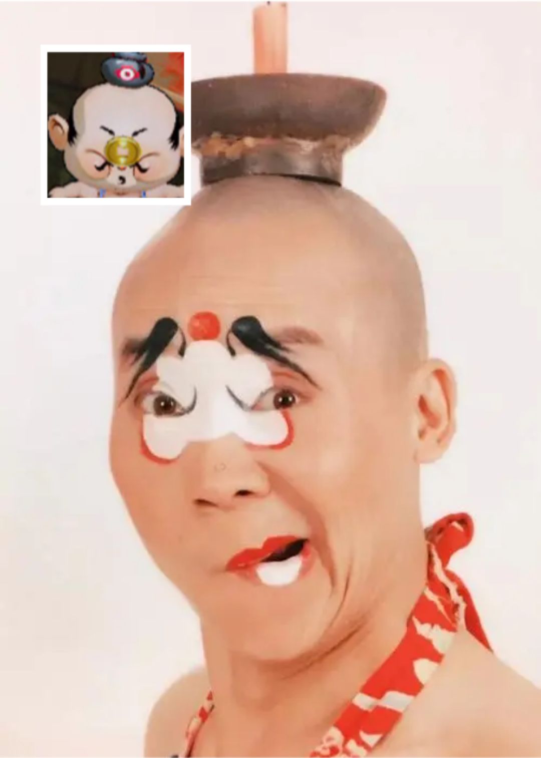 ② 日本武士在脸上的妆容多以红白色颜料显示决心、黑色加粗眉毛显示威严或戴面甲保护面部,不论是外观上还是寓意上,这都与大头鼻头上的金色铜钱不符合。
