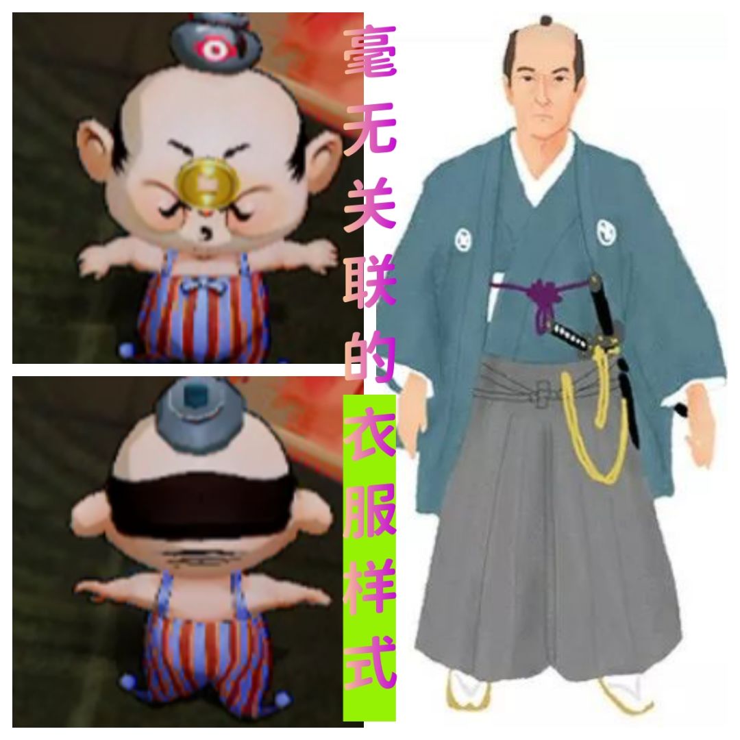 日本武士服多为黑白灰蓝系,“小日子” 大头怪衣服是红蓝条纹,款式和寓意皆无关联,差异明显。