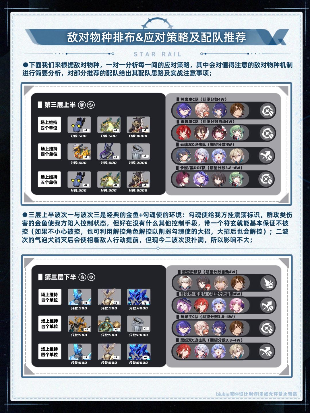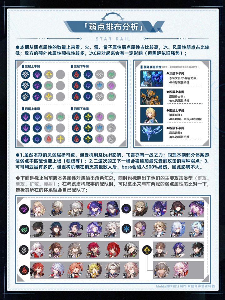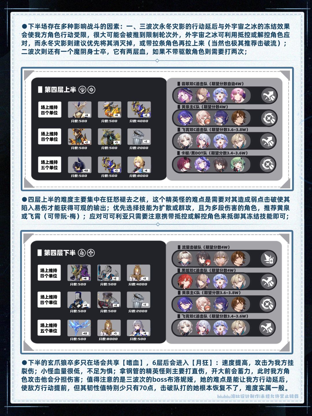 本期较高光的体系是飞霄追击、翡翠追击、黑姬双C追击、黄泉主C(虽很难吃到buff,如果有椒丘,本期上下半均可就业)、流萤单/双C超击破;黑姬本期仍然强势(取3W+的成绩还是很轻松的,四层下半甚至开自动可拿满分,是本期除流萤外第二个容易拿满分的配队);其中受四层上半狂怒褪去之核精英怪影响,银枝队走下半会更易拿得高分;