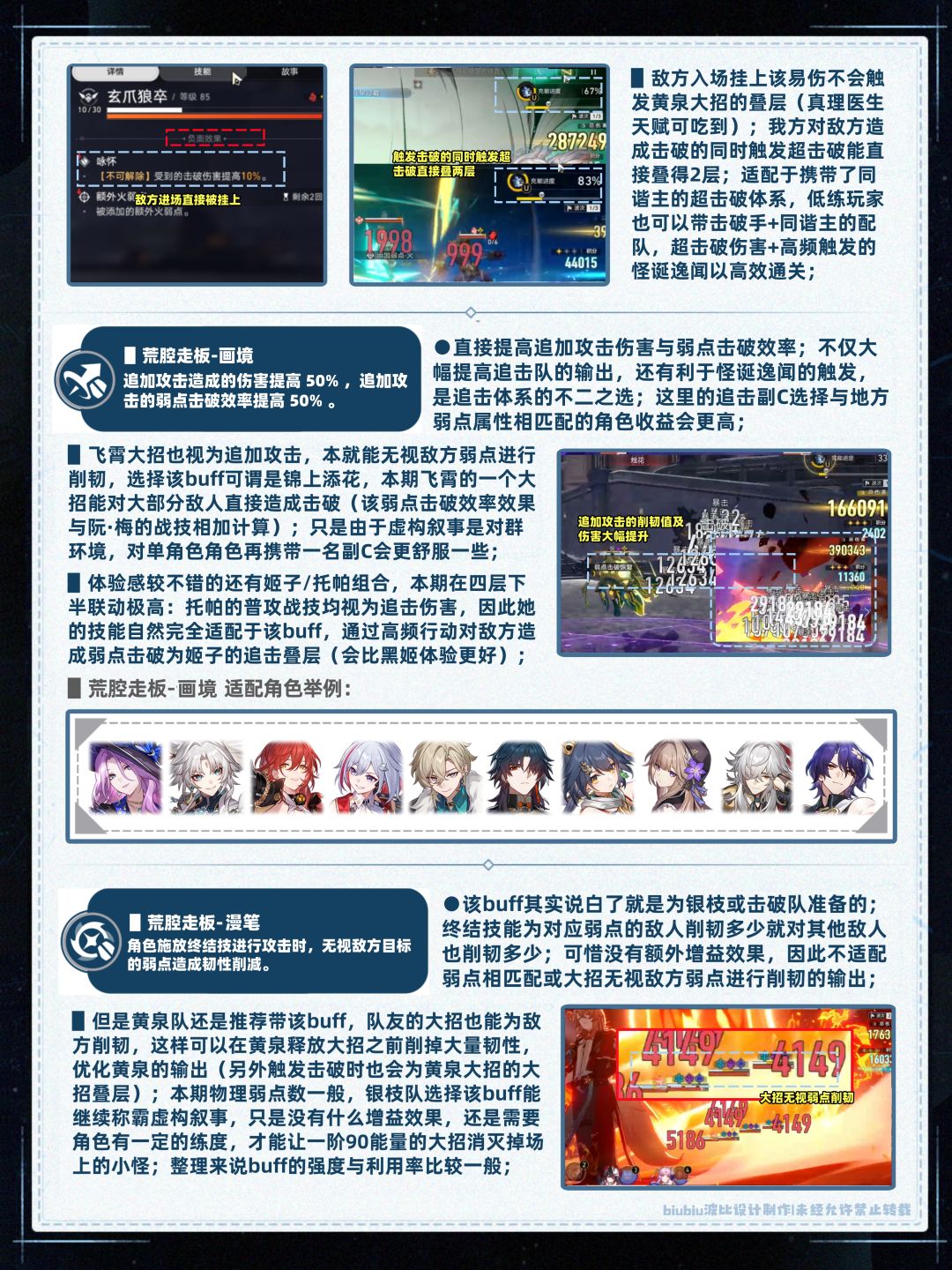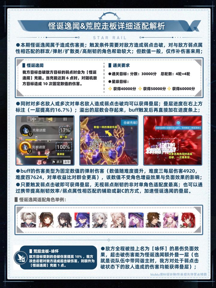 本期虚构叙事综合难度依旧适中,环境上较适配追击队与击破队;怪诞逸闻及荒腔走板均在强调弱点削韧的重要性,其中含无视弱点削韧与提高削韧效率的buff;因此虽然敌方无风弱,但对单+大招追击+无视弱点削韧的飞霄本期选buff2,依旧能取得3W分(建议手动,一个大一个精英怪);