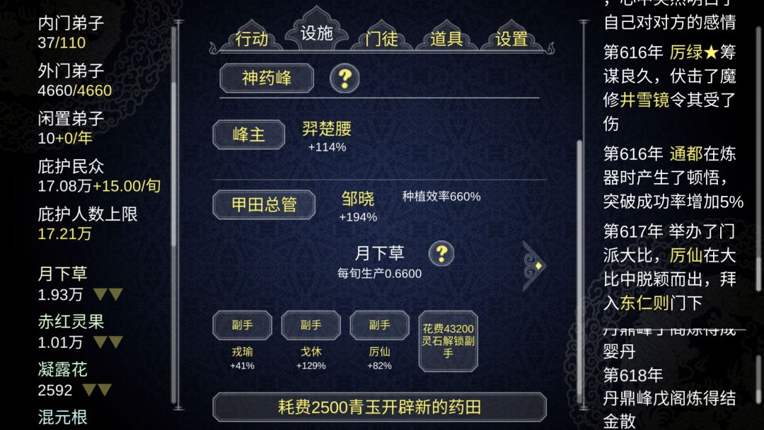 萌新想问神药峰和灵矿峰有什么用啊,叠了600多了效率还是很低,甚至每旬连1个最低级的月下草都种不出来,连主峰的外门弟子都比不了。除魔到了鬼影森林才有月下草,后面的图都不掉,点到死。