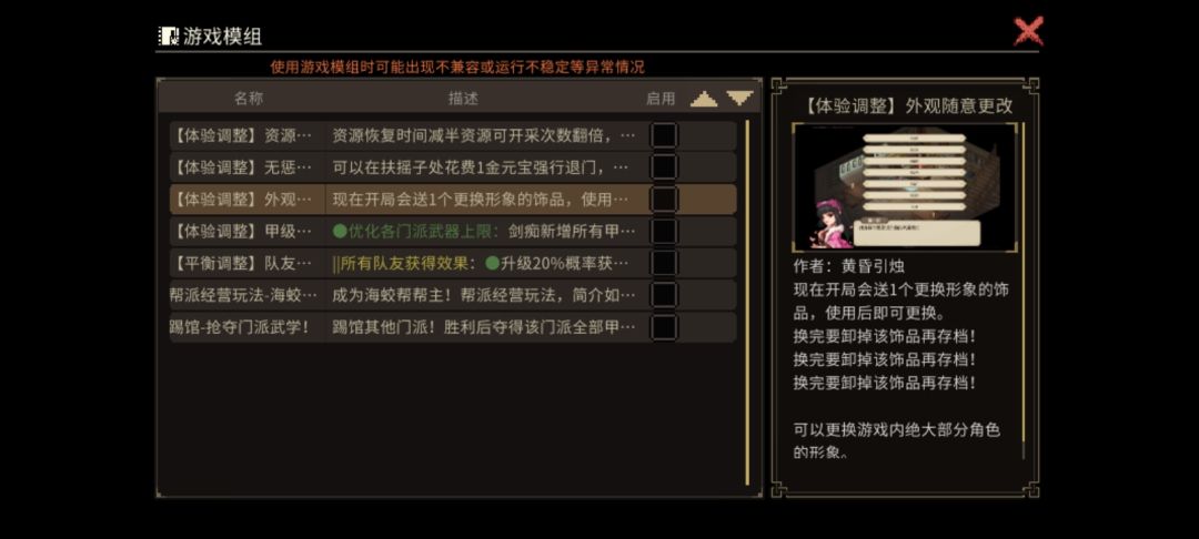 4.我举一个例子,某件道具原版的用途是加入某个门派,mod版本这个道具的作用被移出了。玩家可以直接加。