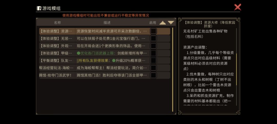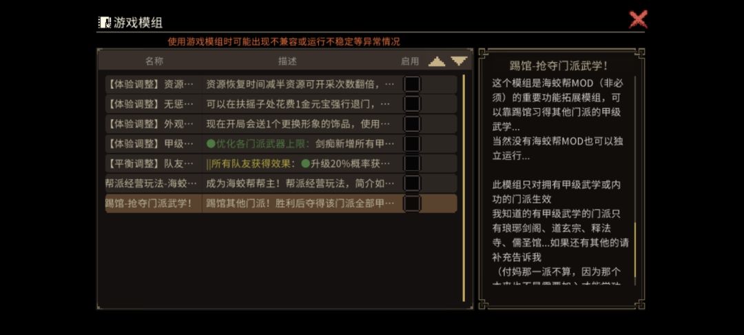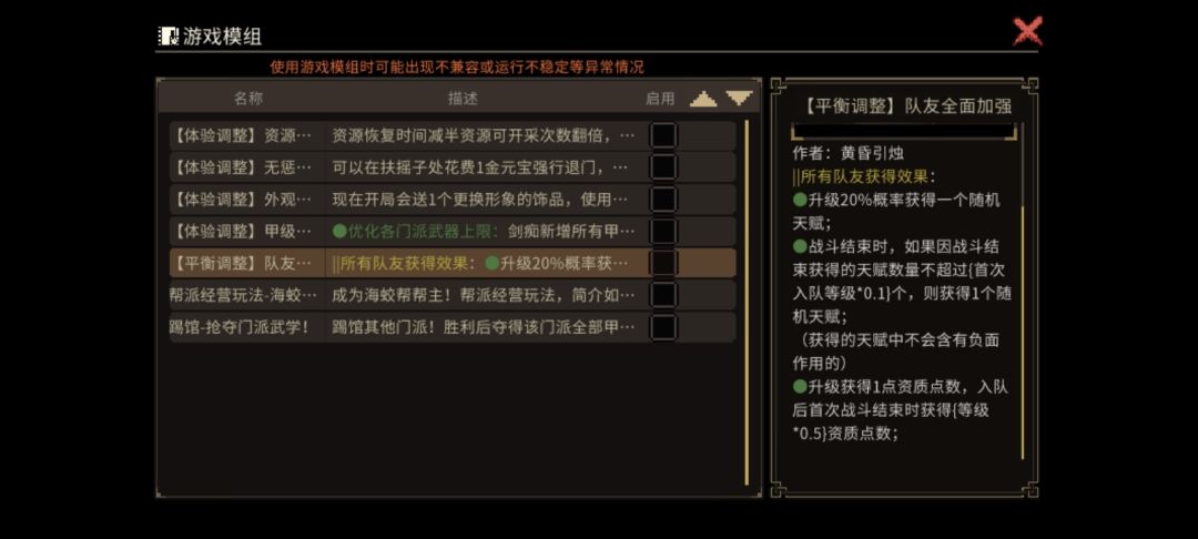 队友强化,别看只修改了可招募队友的强化规则。但是其实这个mod至少修改了门派规则,npc池子以及编号,技能池子,战斗奖励规则。所以属于一个只能单独使用的mod才是最佳。