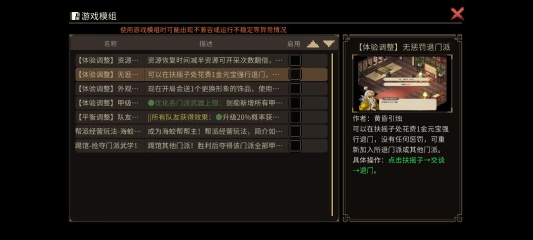 退门派无惩罚。这个mod也是一个微小型mod,只修改了退门派的机制。尽量不要和其他修改过门派的mod一起使用。和海蛟帮的那个mod估计有一定的冲突的。。