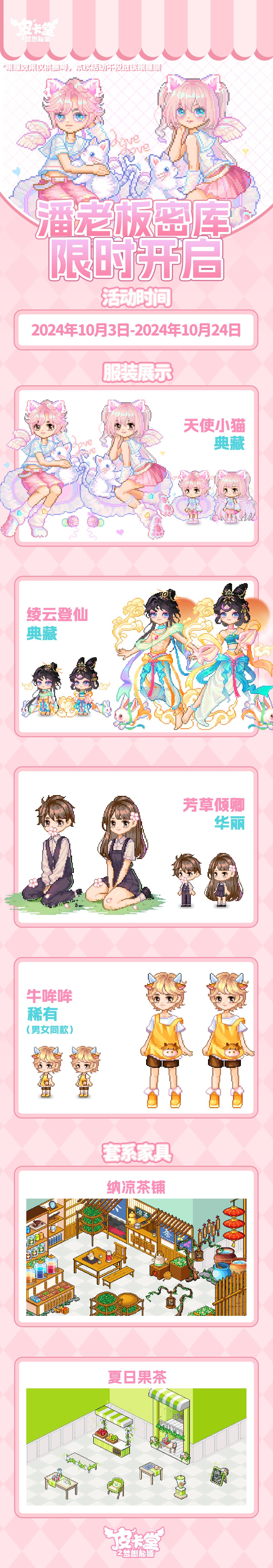 -【潘老板密库】上线!参与活动可获得典藏套装「绫云登仙」、典藏套装「天使小猫」、华丽套装「芳草倾卿」、稀有套装「牛哞哞」以及「纳凉茶铺」和「夏日果茶」套系家具!