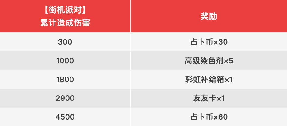 在活动时间内,肠肠加入街机派对并累计造成伤害就可以获得占卜币、友友卡、高级染色剂、彩虹补给箱等多重奖励!
