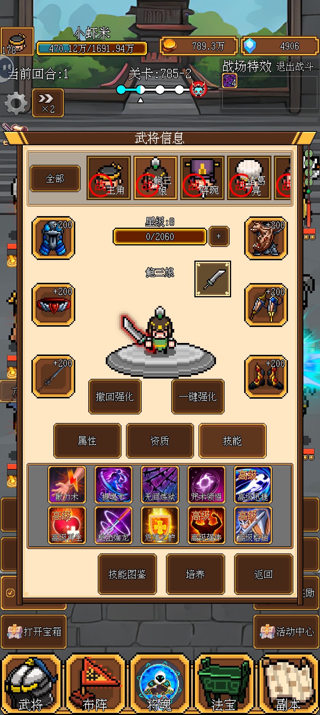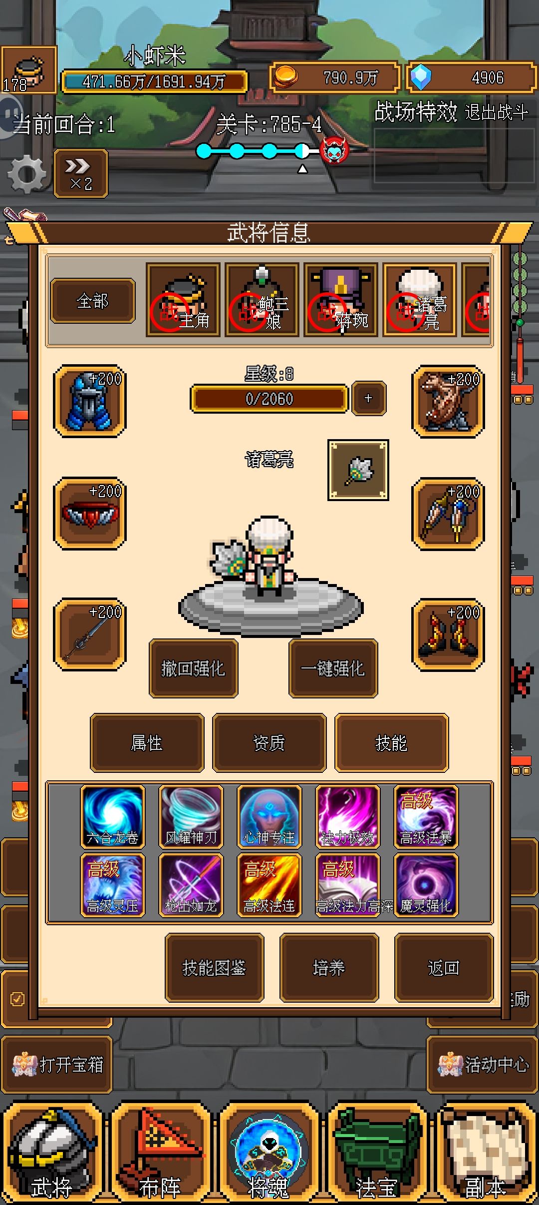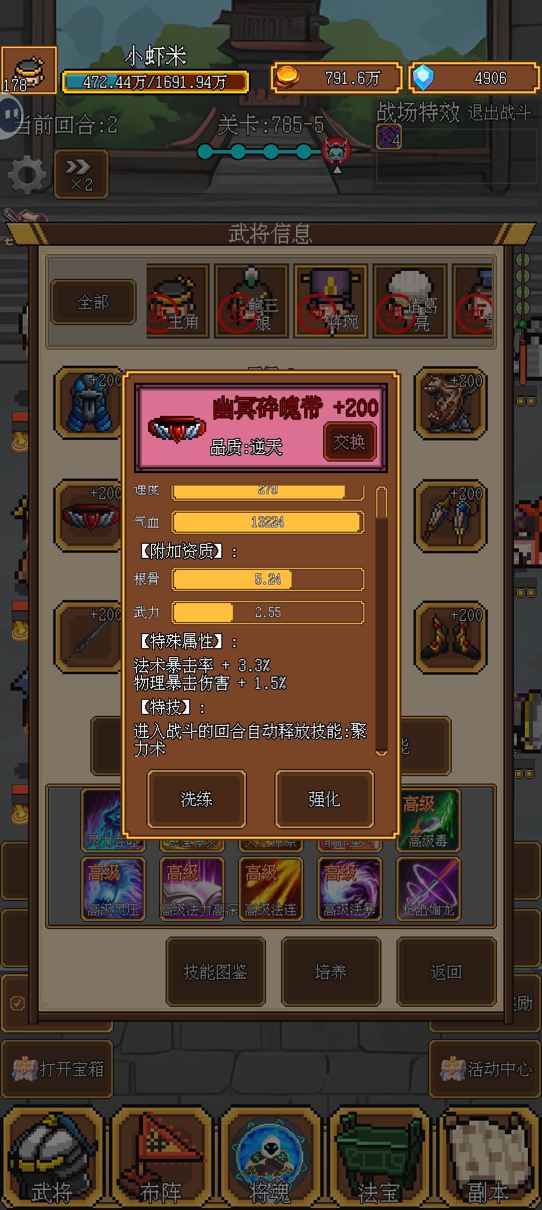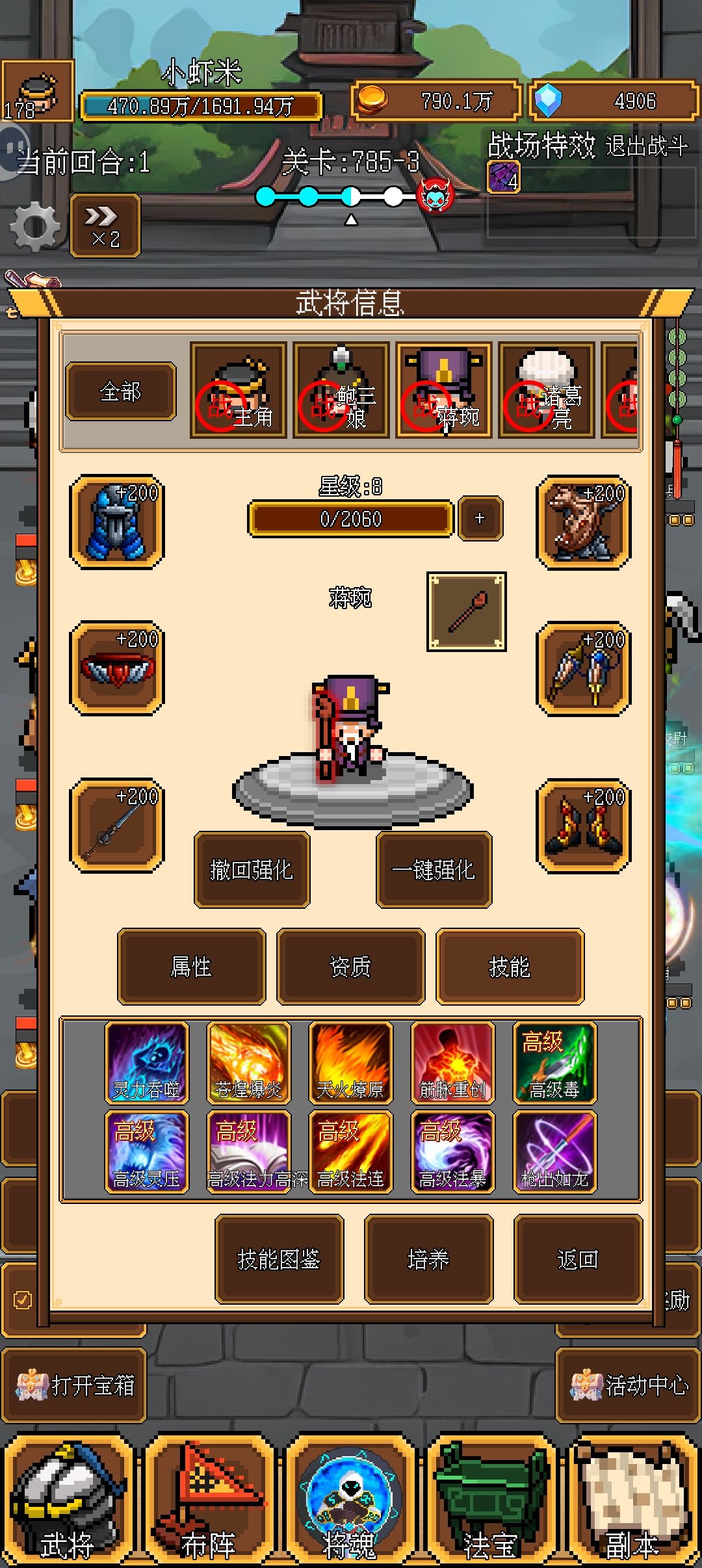 看没人发布关于法师的正经全套,我发一下我的吧,玩了三天半吧算是,这套属于换阵容后的,开始没郭嘉和的时候就先用着吕布,后面签到三天领了郭嘉直接用碎片升满星,然后除了三娘加根骨,剩下所有武将加智力,转生开始就是四智力一敏捷,装备洗炼以法连和法爆几率为最佳法宝用魂帆,剩下的就全搞法伤有关的就可以,聚力术只有腰带能洗出来,装备可以交换,1000 钻石,要是三娘和蒋琬没出聚力就出了好的法术装备可以替换后点交换换给别的武将,然后有钱再继续洗,洗装备幸运满必出逆天装备,从 0 到一百需要 5 万钻,所以一般建议钻石有五万以上再洗,要不心里痒痒,这套阵容就是拼的运气,只要几个法师出连击加暴击基本都能过,等一转学了转生技能法连有时一个法师能连续放四五次技能,还有一点,进入战斗长按武将会出现详情,速度影响出手顺序,我这套出手顺序是鲍三娘、郭嘉(郭嘉能减速)蒋琬、诸葛、主角!先到这,有啥问题再留言问