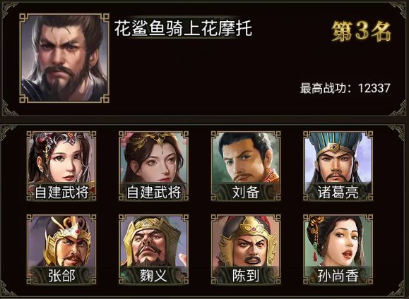 位列第三的是 花鲨鱼骑上花摩托 军团,以 12337 的好成绩拿下第三,超越自我!