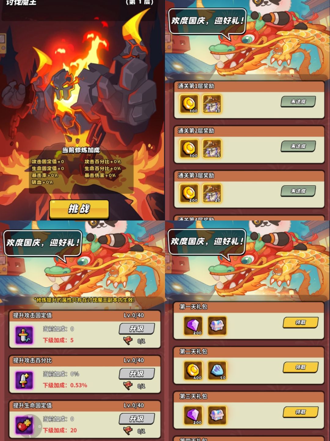 讨伐魔王共十层,每通关一层既可领到相应层数的奖励,可以通过野外挂机的方式获取到旗子, 获得到的旗子用于修炼提升单副本内的属性。另外国庆七天每天还有礼包可以领哦~