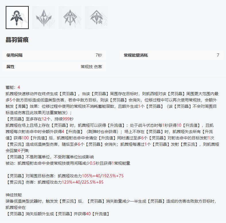 发射冰箭冻结目标6秒,消耗50不高,重点不只是这个技能本身的伤害,更在于控制和神经技能。左边效果是爆发技可以直接触发一轮炮塔射击,这意味着可以在9炮台的情况下打出一轮爆发:射击触发+爆发技正好打满2轮炮台的伤害。右边效果是释放后回复满常规技层数。这样就达成了完全的循环,即设置满炮台后打出触发+爆发技的2连触发爆发,并回满充能进入下一轮循环。