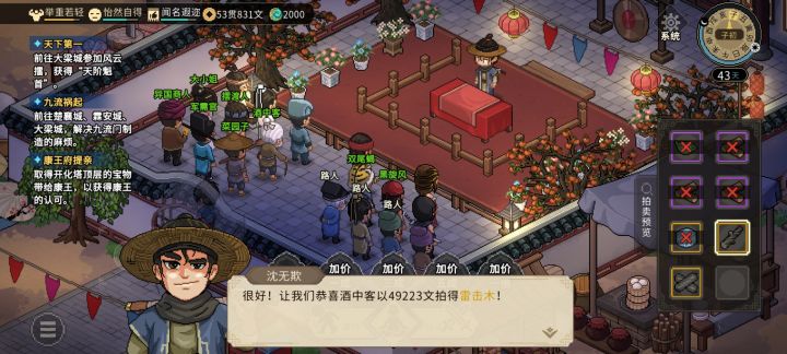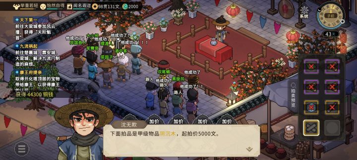 第四步前往夜摩坊,参加拍卖会。夜摩坊的拍卖会每天子时都会有,雷击木阴沉木和甲级矿石起拍价是5000,基本都会涨到49223卖出去(偶尔会低一些),每次拍卖基本都能赚44贯钱,拍卖完以后不用走,直接打坐到第二天子时继续拍卖就好。比赌场来钱快,比竞宝大会省事,最重要的是夜摩坊解锁很早,在大梁城的客栈里听路人说话就能解锁,安全方便快捷,也不用打打杀杀。