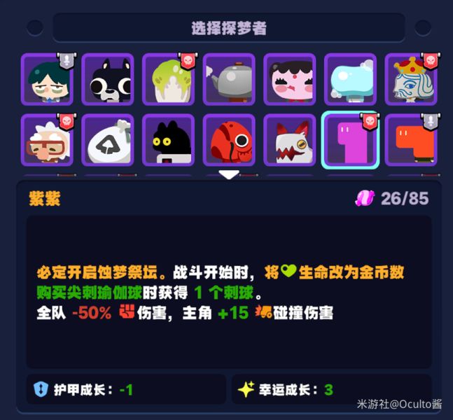 紫紫会在战斗开始时候将生命数量改成金币数量,选择紫紫时不要在商店内购买物品,紫紫每回合必定开启祭坛,可以通过消耗血量在祭坛处购买物品。