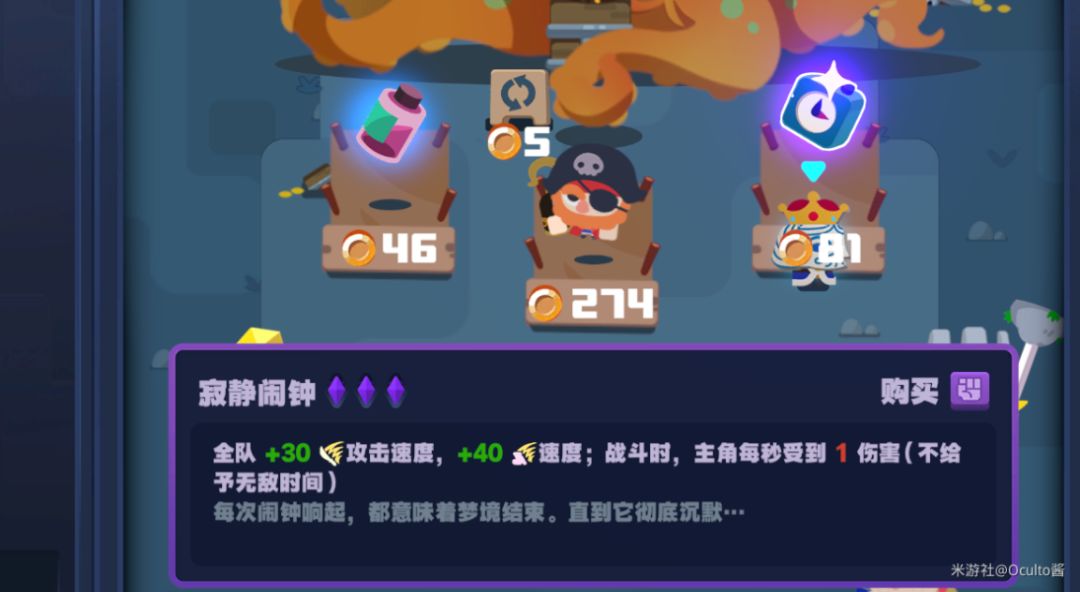 老顽童的爆炸触发方式是受到伤害,寂静闹钟会使得每秒造成1点伤害,实战效果来看会一直爆炸。购买该道具前建议凑齐水果羁绊增加生命恢复,场内游走吃心即可杀穿全场。