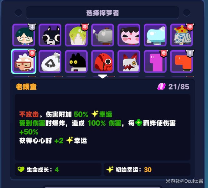 同样也是主角无法攻击,老顽童受到伤害会爆炸,造成100%伤害;由此可见,选择老顽童当主角可以直接当成碰碰车来玩,到处创人;但是主角选择老顽童不要跟Boss硬刚,BOSS碰撞是多次判定,容易一波送走。