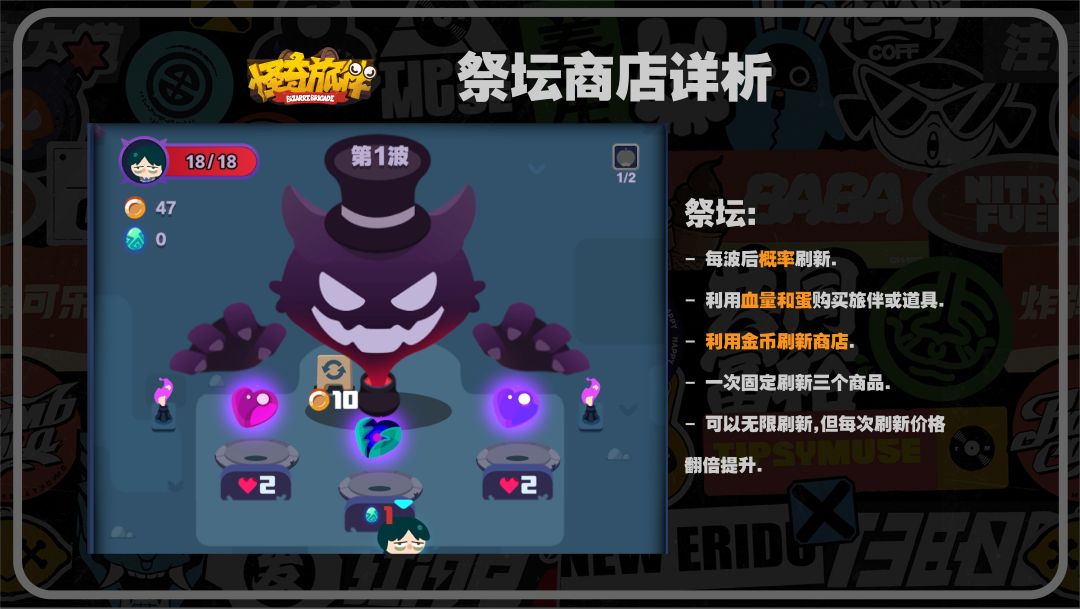 蛋:可以在每一波次结束后,概率刷新的祭坛内购买强力旅伴或道具。蛋可以通过击杀敌人、开启宝箱获得。