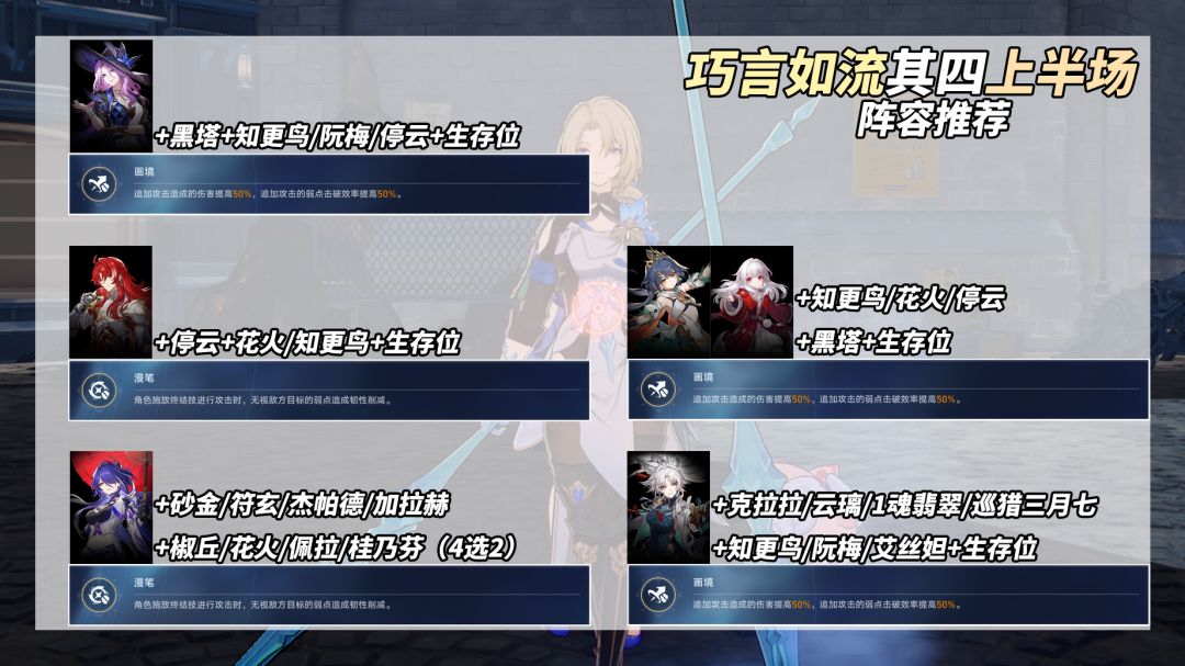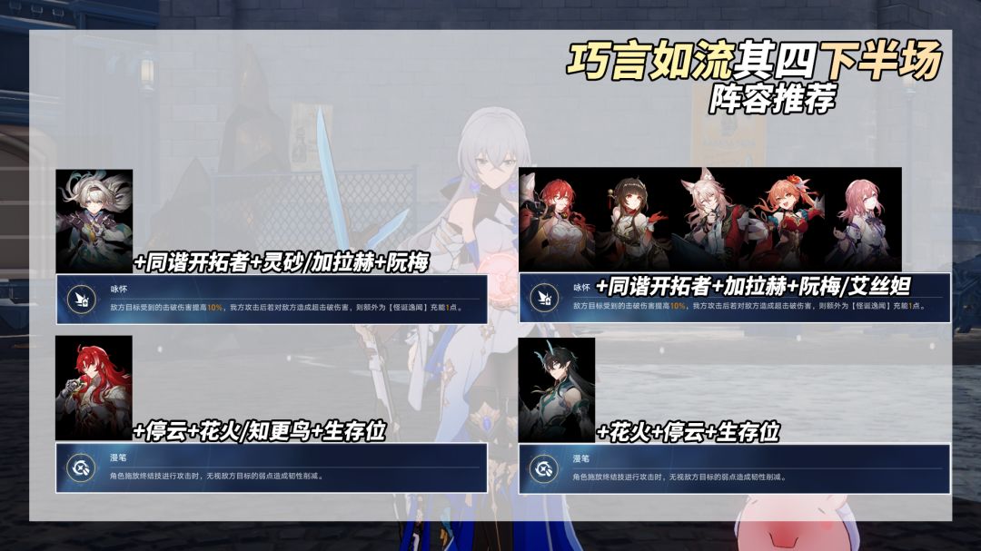 以上就是本期2.5虚构叙事巧言如流攻略,希望可以帮助到你。有培养追击/超击破/群体大招流任意其2的玩家,本期满星应该还是可以的。
