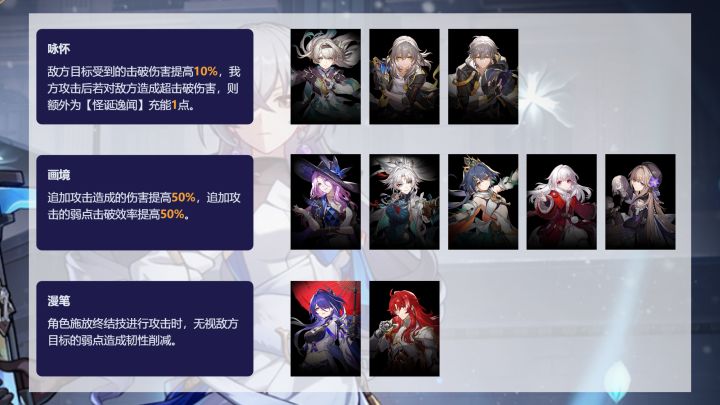 Buff①咏怀,适合‘多目标、超击破’体系。推荐:流萤、以及部分搭配同谐开拓者的智识角色。