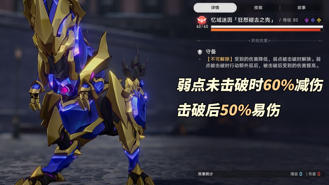②忆域迷因「狂怒褪去之壳」局内有5只,弱点未击破时60%减伤,第1波2只14万生命值,第3波3只32万生命值。大幅延缓了得分进度,队伍中存在高效单体削韧角色时更好处理。