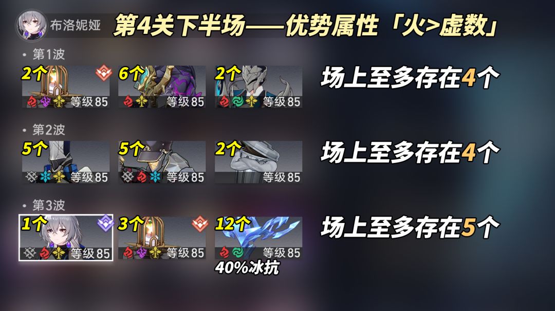 下半场并无机制怪,但敌人整体血量会更高一些。所幸敌人弱点分配还算合理,火/虚数超击破队可作为稳定3万+得分点,将得分重心放在上半场。