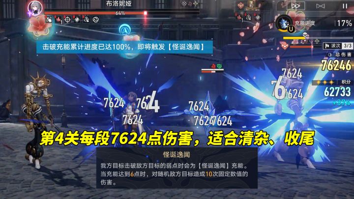 击破敌方弱点获得约16.67%充能,满6次后造成10次随机伤害,以第4关为例,单段7624点伤害,数值不高勉强用于清杂、收尾。