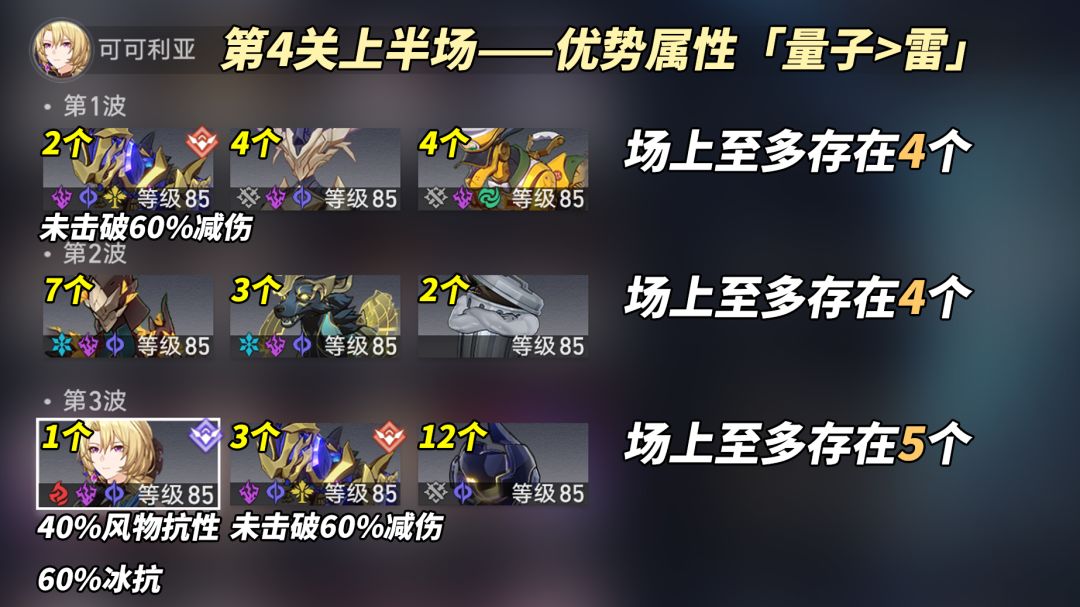 优势属性「量子>雷」,敌人抗性「可可利亚40%物理风抗性、60%冰抗性」。