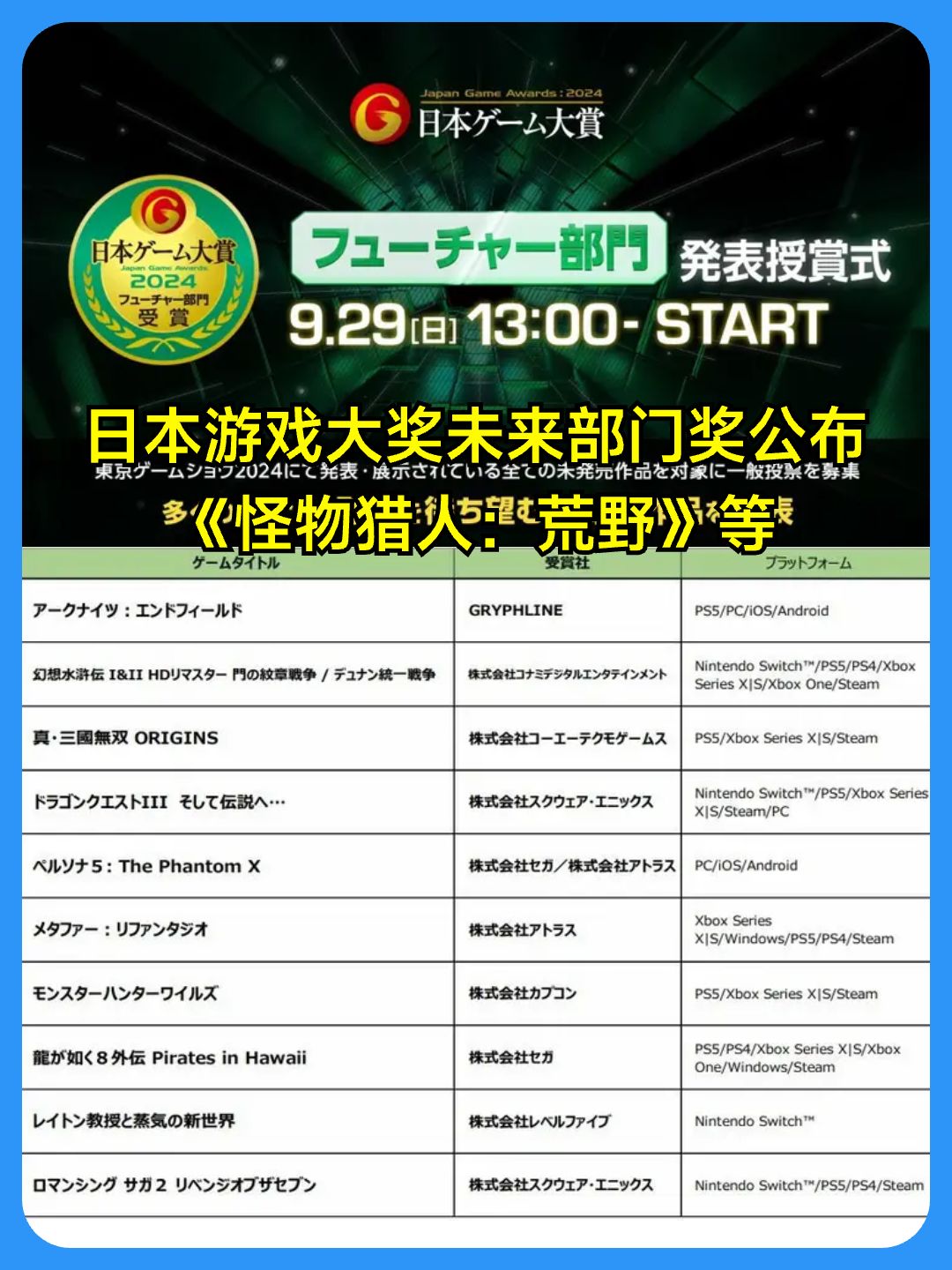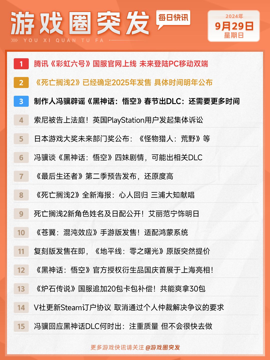 1️⃣腾讯《彩虹六号》国服官网上线 由腾讯代理、育碧研发的《彩虹六号》国服官网已上线。 今年8月,《彩虹六号》国服获得进口网络游戏版号,并进入上线筹备阶段。同时,《彩虹六号》国服官方社媒阵地已经上线,作为接下来公布测试与上线计划的平台。 官方表示,未来《彩虹六号》国服将在客户端和移动端发行,以满足不同平台的游玩需求,提供原汁原味的战术射击游戏体验。官方将与玩家一同前行,营造公平良好健康的游戏环境。 2️⃣《死亡搁浅2》已有内部发售日期 预计明年正式官宣 在《死亡搁浅2》TGS特别舞台节目上,游戏制作人小岛秀夫再次强调了《死亡搁浅2》将于2025年发售,并且开发团队已有内部发售日期,而具体信息将在明年的某个时候公开。 3️⃣冯骥辟谣《黑神话:悟空》春节出DLC:还需要更多时间 近日,在接受央视中国电影报道的采访时,《黑神话:悟空》制作人冯骥回应了游戏何时推出DLC的问题,他否定了春节将推出DLC的传闻,同时表示以高出《黑神话:悟空》现有质量的标准去制作资料片或新产品并不是当前的首要任务,开发团队还需要更多时间去思考,了解新的技术和题材,希望玩家们能够理解。 4️⃣英国PlayStation用户向索尼发起集体诉讼 英国一起针对索尼的集体诉讼已被正式确认将于2026年3月2日开庭审理。此次审判预计总共持续八周时间。此案中,索尼被指控存在非法行为,因其对数字内容(包括附加内容)收取过高的价格。 5️⃣日本游戏大奖未来部门奖公布:《怪物猎人:荒野》等 9月29日,在日本游戏大奖未来部门奖公布了获奖名单,该奖项面向所有在2024年东京电玩展上宣布和展出的未发售作品开放,根据玩家投票,选出最受期待的作品,共10款游戏获得该奖项。 6️⃣冯骥谈《黑神话:悟空》四妹剧情 日前,游戏制作人冯骥接受了央视的专访,在专访里,冯骥谈到了蜘蛛精四妹的剧情,并表示玩家对四妹意难平,这件事情反过来也会启发制作组 7️⃣《苍翼:混沌效应》手游版发售 2D动作rogue游戏《苍翼:混沌效应》手游版今日发售。本作采用免费下载,内容买断的形式,游戏内容包含当 PC版除联机协作外的几乎所有内容,适配iOS,Android和HarmonyOS。 #黑神话悟空 #黑神话悟空DLC #死亡搁浅2 #彩虹六号