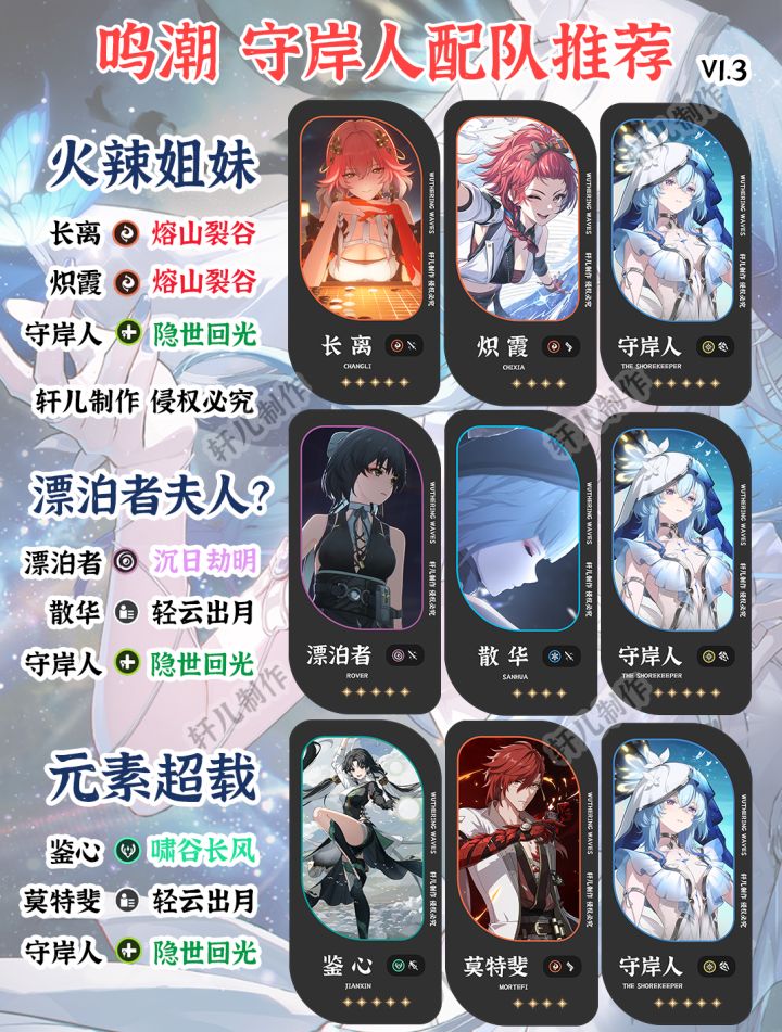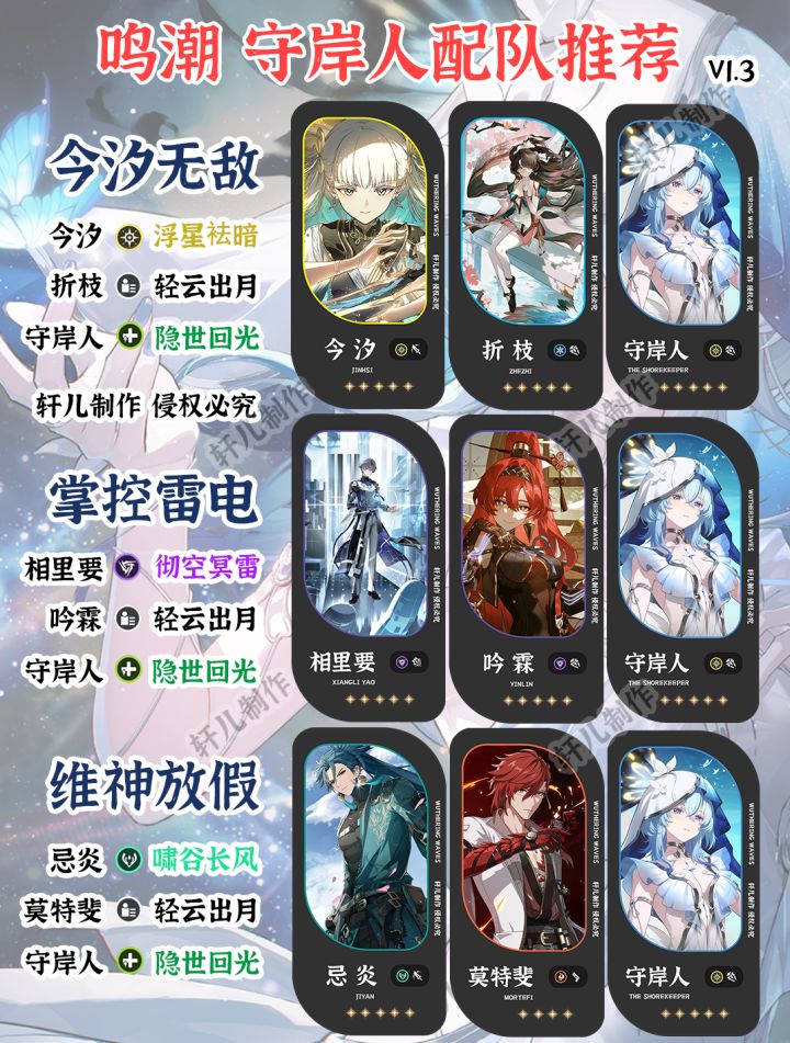 掌控雷电队:相里要+吟霖+守岸人相里要和吟霖的搭配无需多言,这里维里奈替换成守岸人有个小点需要注意:守岸人可以给主C加暴击率,所以可以考虑里哥声骸用更多的暴击伤害循环:守岸人-吟霖-相里要