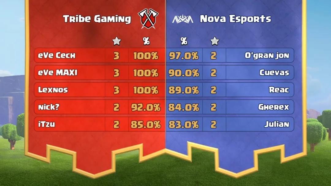 第二场对决在大家熟悉的Tribe Gaming与Nova Esports之间进行。比赛一开始,Tribe Gaming就展现出强队气场,首发队员eVe Cech干净利落拿下一个3星胜利,给对手带来巨大压力。最终Tribe Gaming三人拿下3星,以13星95.4%平均摧毁率的强悍战绩击败Nova Esports成功晋级。
