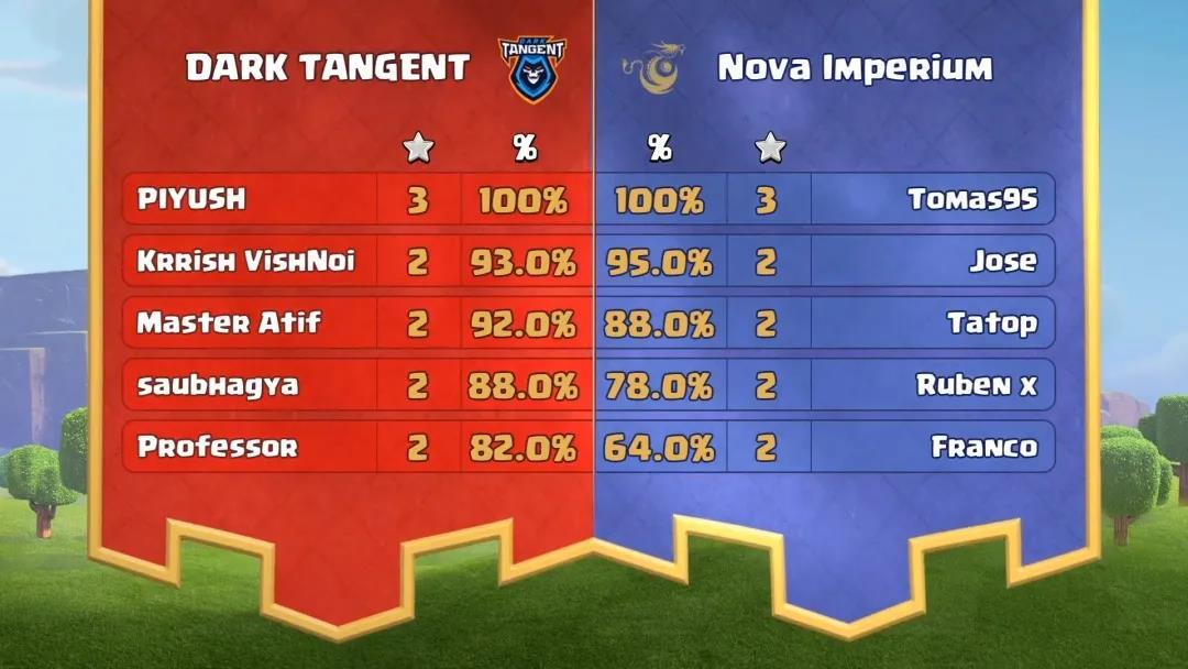 两支实力十分接近的部落上演了一场攻防大战。DARK TANGENT队员PIYUSH使用在比赛中出场率并不高的超级女巫率先拿下3星胜利,之后DARK TANGENT在领先对手1颗胜利之星的情况下一路稳扎稳打。尽管Nova Imperium队员Tomas95在最后一局的进攻中拿下3星追平了总星数,但无奈摧毁率落后,最终遗憾落败掉入败者组。