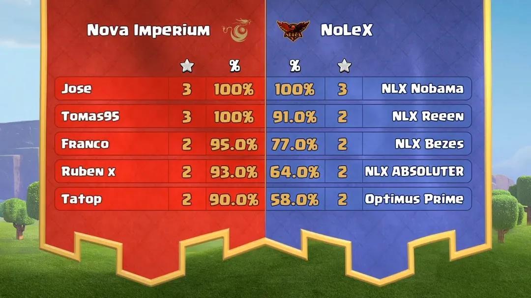 昨晚的最后一场比赛在Nova Imperium与NoLeX之间展开。比赛一开始两支队伍就展现出极高的竞技水准,双方首发队员NLX Nobama与Jose分别拿下3星。但在后续的进攻中,NoLeX的进攻出现疲态,一度打出2星64%摧毁率与2星58%摧毁率的成绩,大幅落后对手。