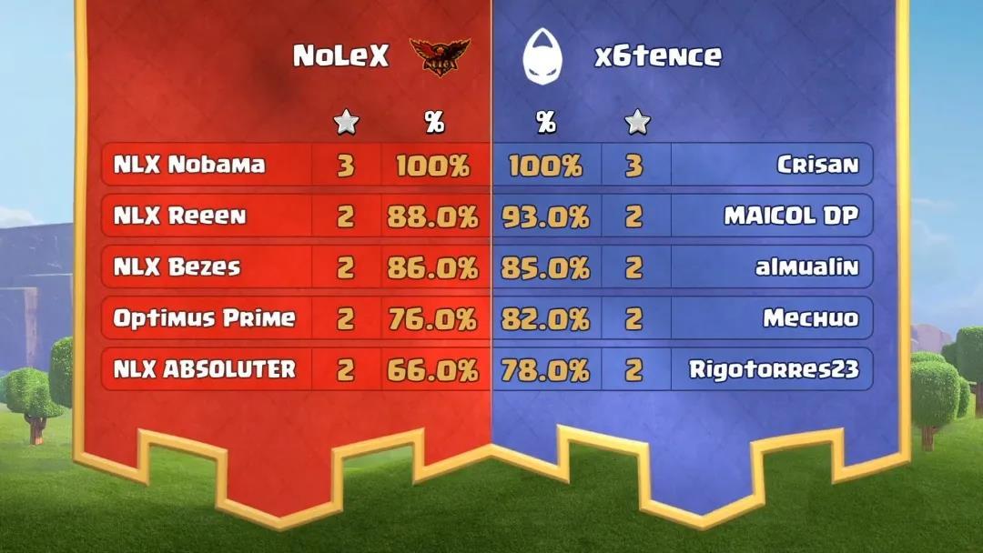 首轮最后一场对决, NoLeX对上x6tence。一开场,来自NoLeX的 NLX Nobama便用矿猪流拿下3星胜利。面对对手带来的压力,x6tence并没有自乱阵脚,在保证2星至少78%摧毁率的情况下,第四位队员Crisan拿下关键的3星胜利,最终在总星数相同的情况下,以领先4.4%摧毁率的微弱优势击败NoLeX顺利晋级。