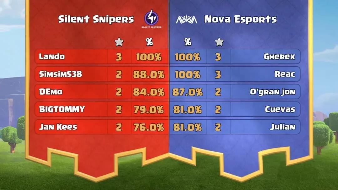 败者组第一场,Silent Snipers遭遇Nova Esports。Nova Esports第二位上场队员Gherex拿下本场比赛第一个3星,埋下了一颗胜利的种子。而带着 1星差距的Silent Snipers的心态并未受到太多影响,凭借第四位上场队员Lando天雪蓝流拿下的3星胜利,将总星数扳平。