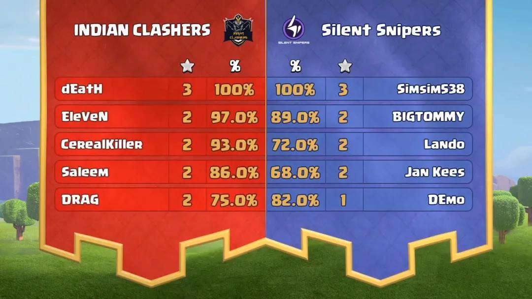 昨晚的首场对战由INDIAN CLASHERS对阵Silent Snipers。在双方首发队员都只拿到2星的情况下,INDIAN CLASHERS第二位上场队员dEatH凭借优秀的矿猪技巧轰下本月晋级赛第一个3星胜利。第四局比赛Silent Snipers队员DEmo出现致命错误,攻城飞艇未能带走对手大本营,仅获得一颗胜利之星。