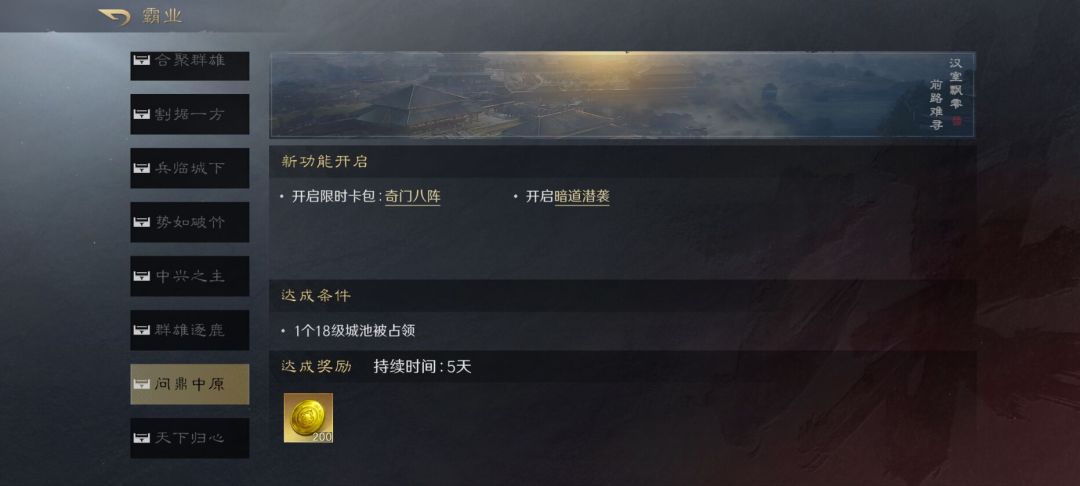当霸业阶段达到“问鼎中原”时将会解锁“暗道潜袭”玩法。