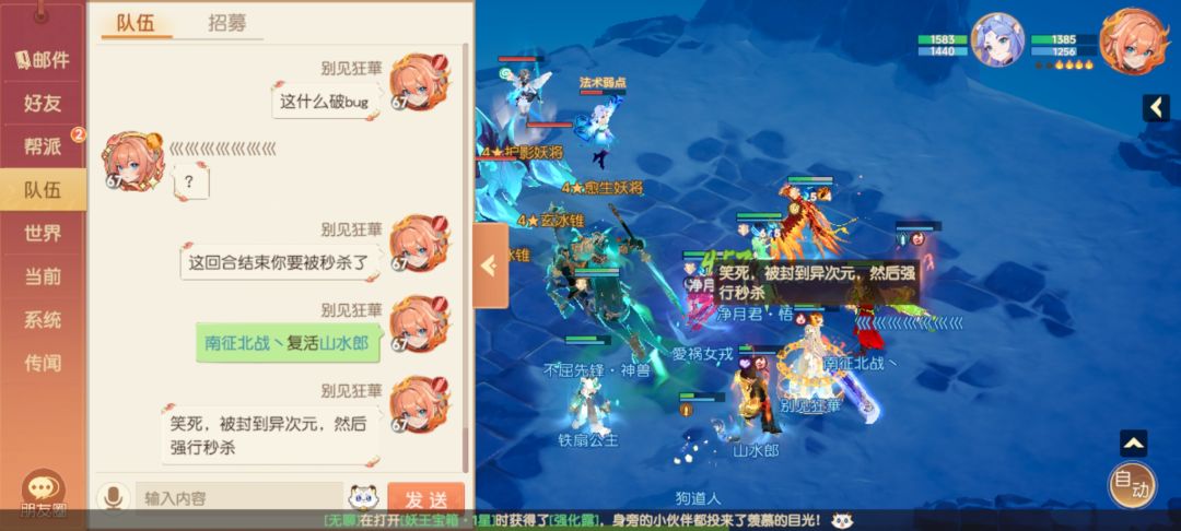 奇数回合:此次妖王机制较为简单,奇数回合随机冰封住我方人物(关冰箱),必须把冰块打掉才能,否则,下回合末结束时,直接秒杀被关的人物,且在回合末还会6名我方单位造成法术伤害