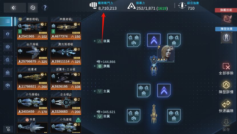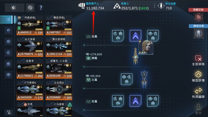 可以看到,越把这艘偏向于防御的德兹塔往舰队挪到主翼时,战力稍微下降了一点,到后翼时候又涨了一点。