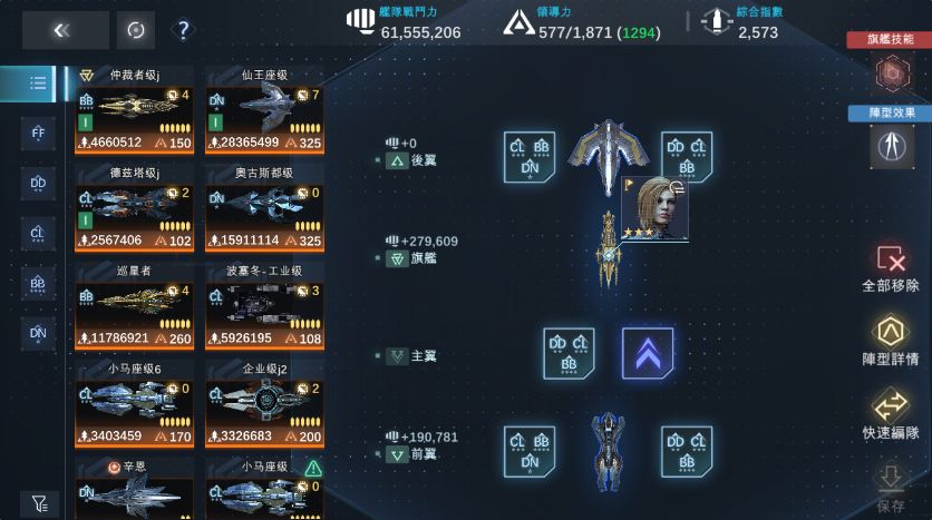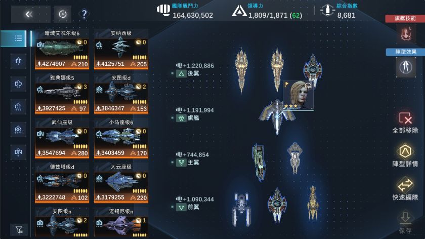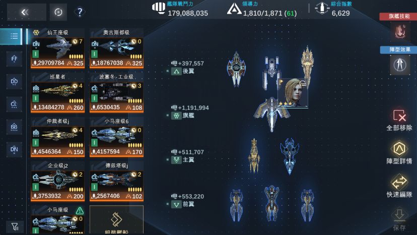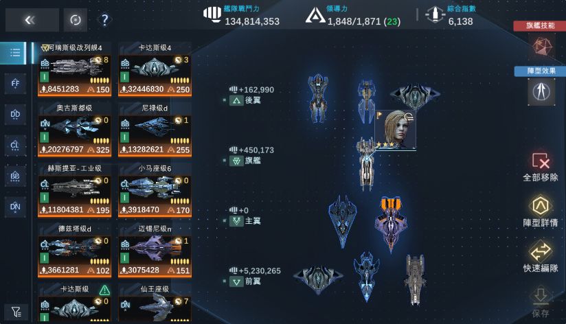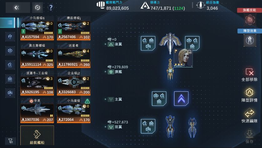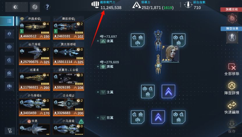 按照之前总结的首条编队规则往里面填完之后,舰队变成了这个样子。